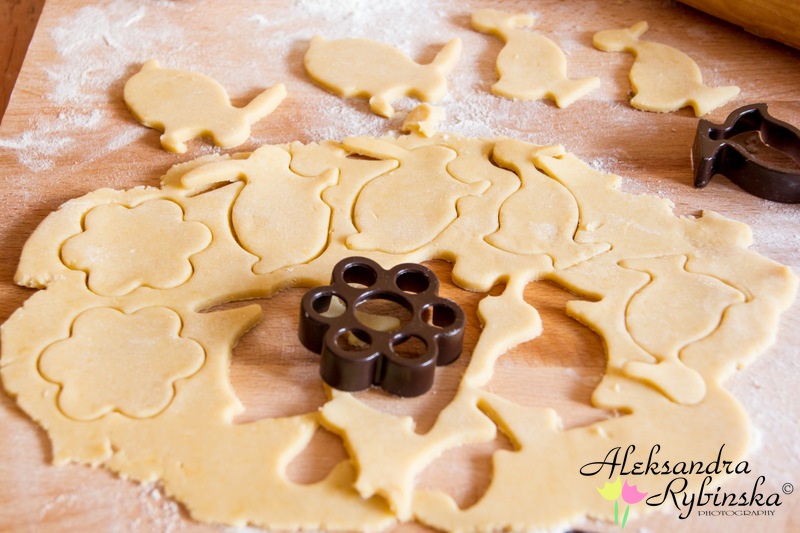 4. Rozwałkuj ciasto na posypanej mąką stolnicy. Wykrawaj z niego wzory za pomocą foremek.